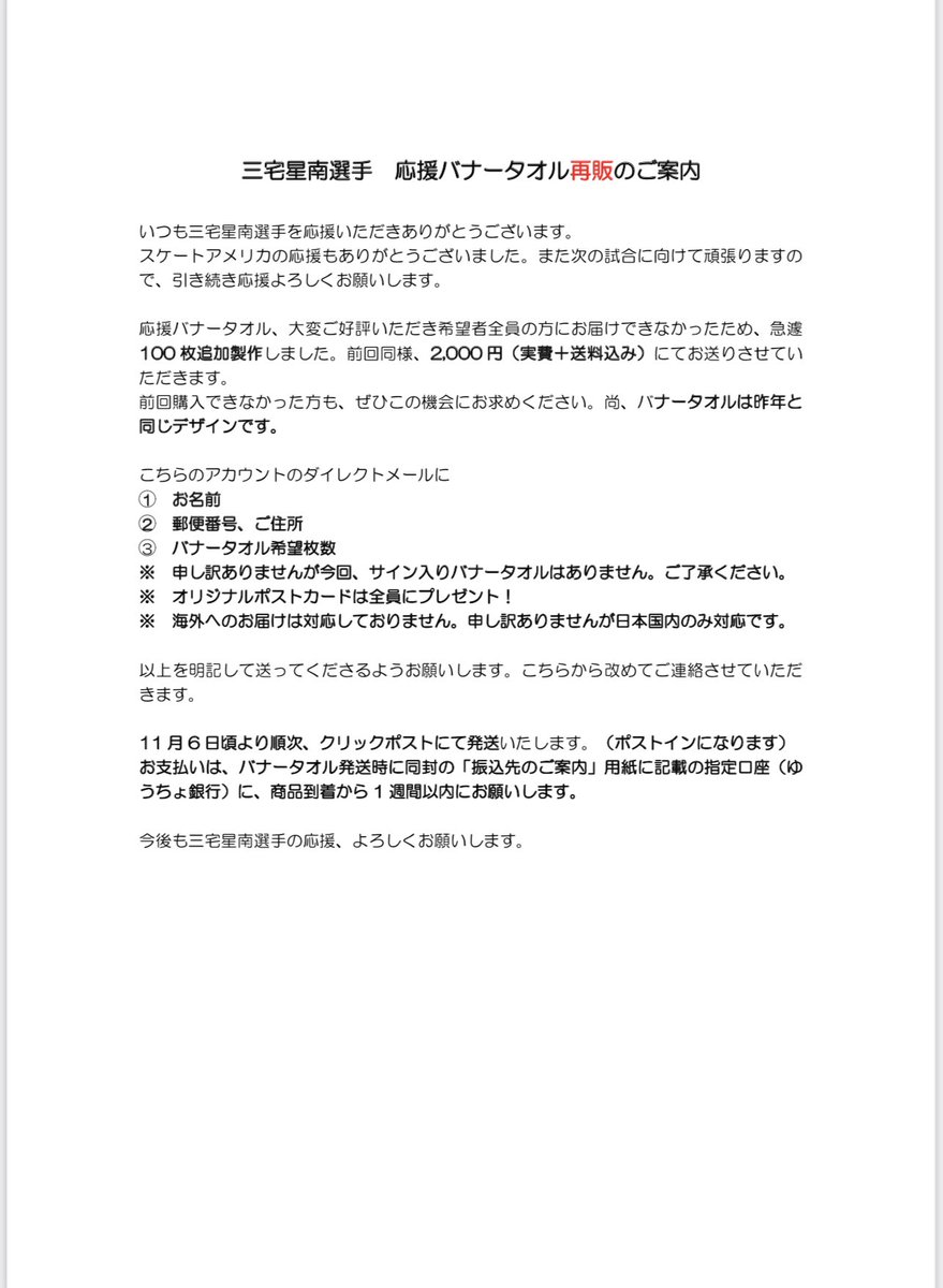 いつも応援頂きありがとうございます。GPSスケートアメリカ🇺🇸グランプリフランス🇫🇷に初参戦の三宅星南選手のバナータオルを製作致しました。今季も応援宜しくお願い致します‼️