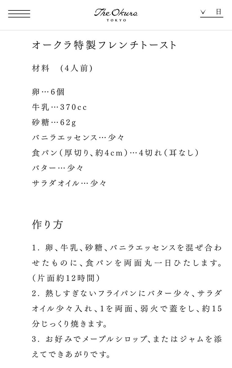 最強のフレンチトーストが作りたくて、調べて辿りついたのが「ホテルオークラのフレンチトースト」の秘伝レシピ。そして昔食べたあの味を再現するには、たまごへの漬け込み時間と焼き方が重要だったとは…… 世界中の舌をうならせてきた味を家で再現できる時代に感謝 theokuratokyo.jp/letter/recipe/…