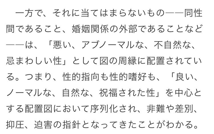 /自分たちの関心が「健全かつ平等なシス男女間の1対1のパートナーシップ」に強く向いていることの現れなのかな、と思う。その1人とかつて仲良くDMしてた頃、彼女は私に自分と夫と生まれたばかりの子どもの3ショットを送ってきたりした。婚姻も子を持つことも許されていない私によくそんなの送れたな/