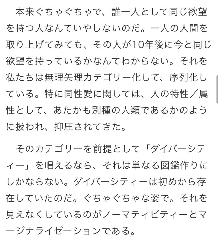 /と呆れたけれど、私は愛想のいい人間なので愛想良く返した。今思い返しても、シスヘテロの性愛だけが正しいと許される社会で、よくもまあ自分の特権性も省みずそんな写真送れたね、と思う。残念ながらシスヘテロの性愛だって暴力性から自由ではないからね。どんなにラブラブでもそれは変わらない。/