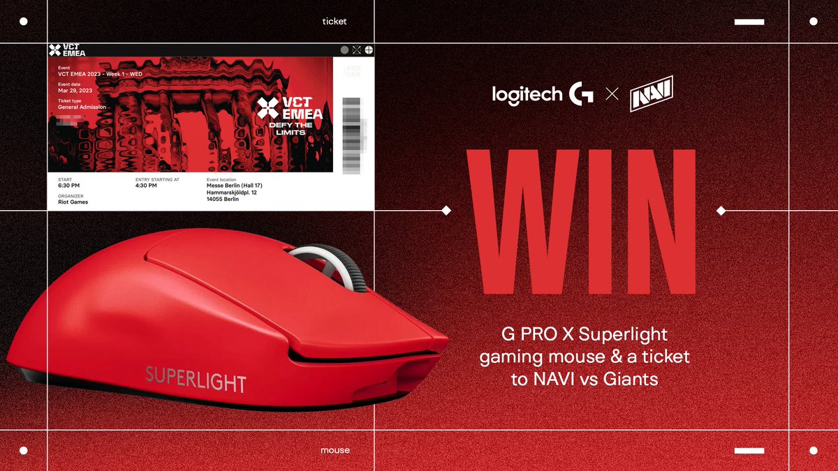 Follow @NAVIValorant, @LogitechGesport, like this tweet, and RT to participate in the raffle of G PRO X Superlight & 1 ticket to our #VCTEMEA match vs Giants on March 29th. We will select the winner on March 27th and see you in Berlin!