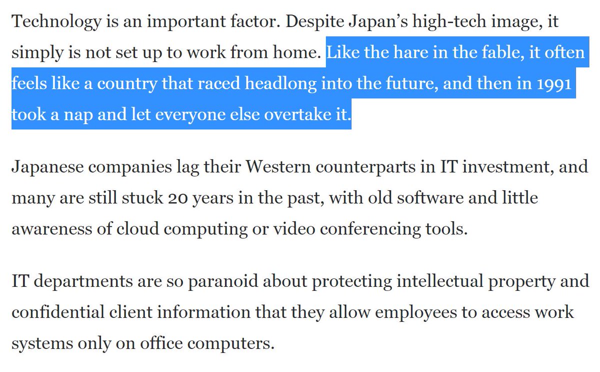 RT ワシントンポスト痛烈に書いてくれている。「まだファックス送ったり書類にハンコ押したりしてる国」「日本の企業風土は過去の遺物。様々な女性差別があり頭の堅い年配男性が権力を握っている」washingtonpost.com/world/coronavi…