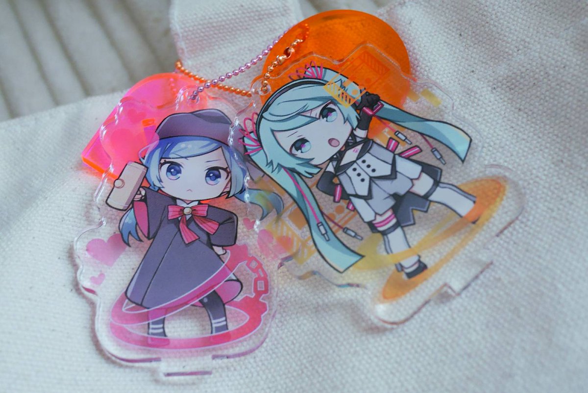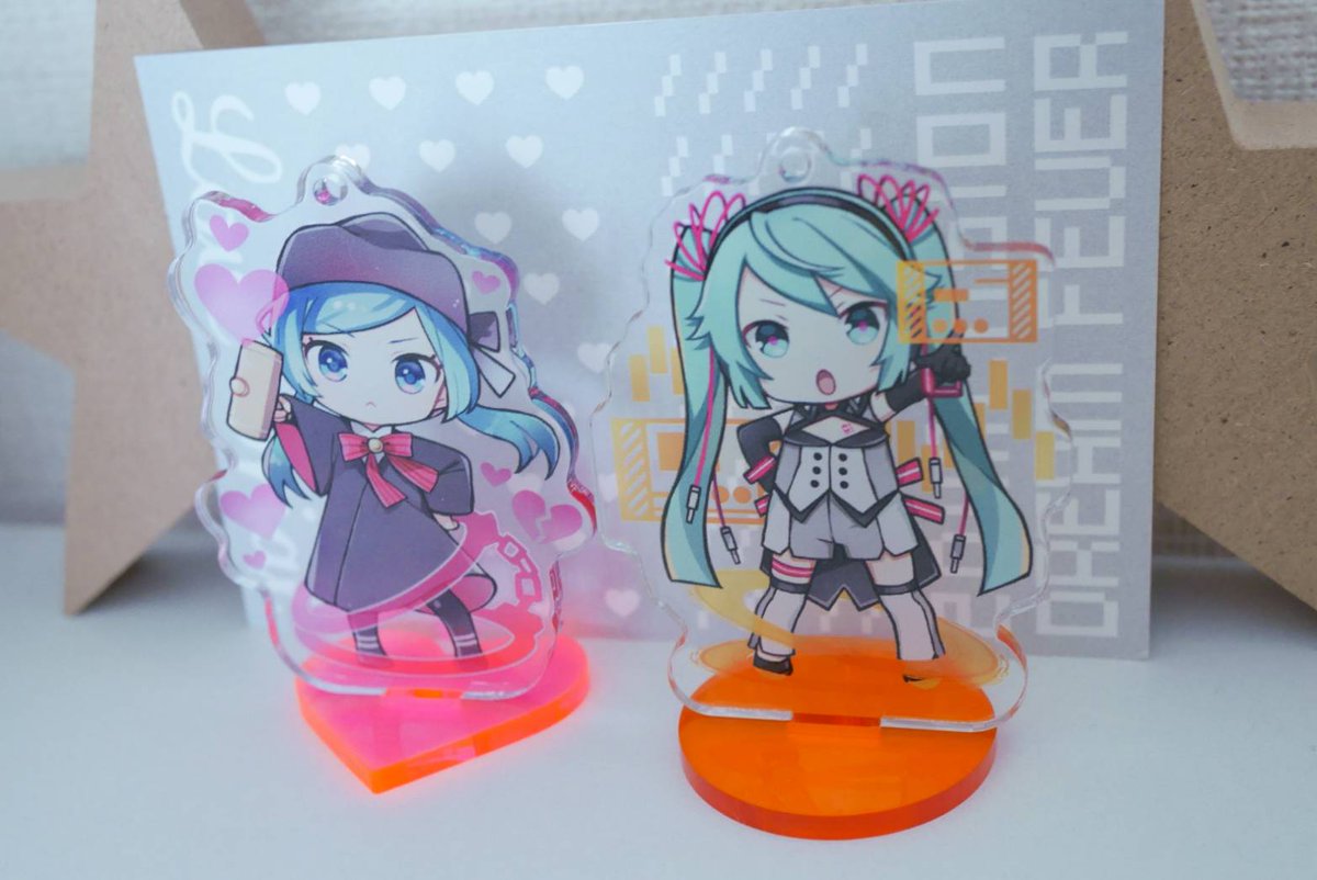 冬コミ~BUZZさん(@BUZ2)と一緒に「恋愛裁判」と「二次元ドリームフィーバー」のアクリルスタンド作ったよ~台座もハートと丸だよ あとチェーンもついてるのでアクキーとしてもつけられます!かわいくできました