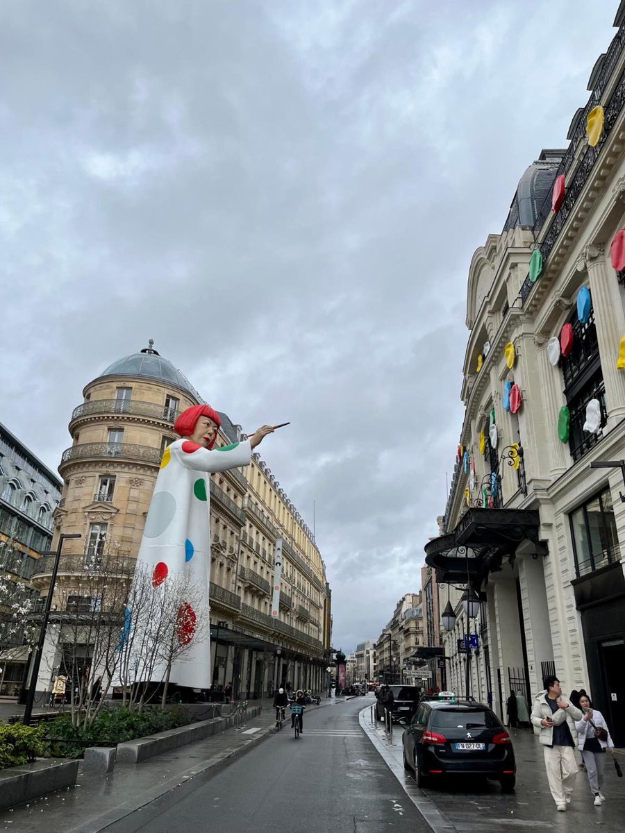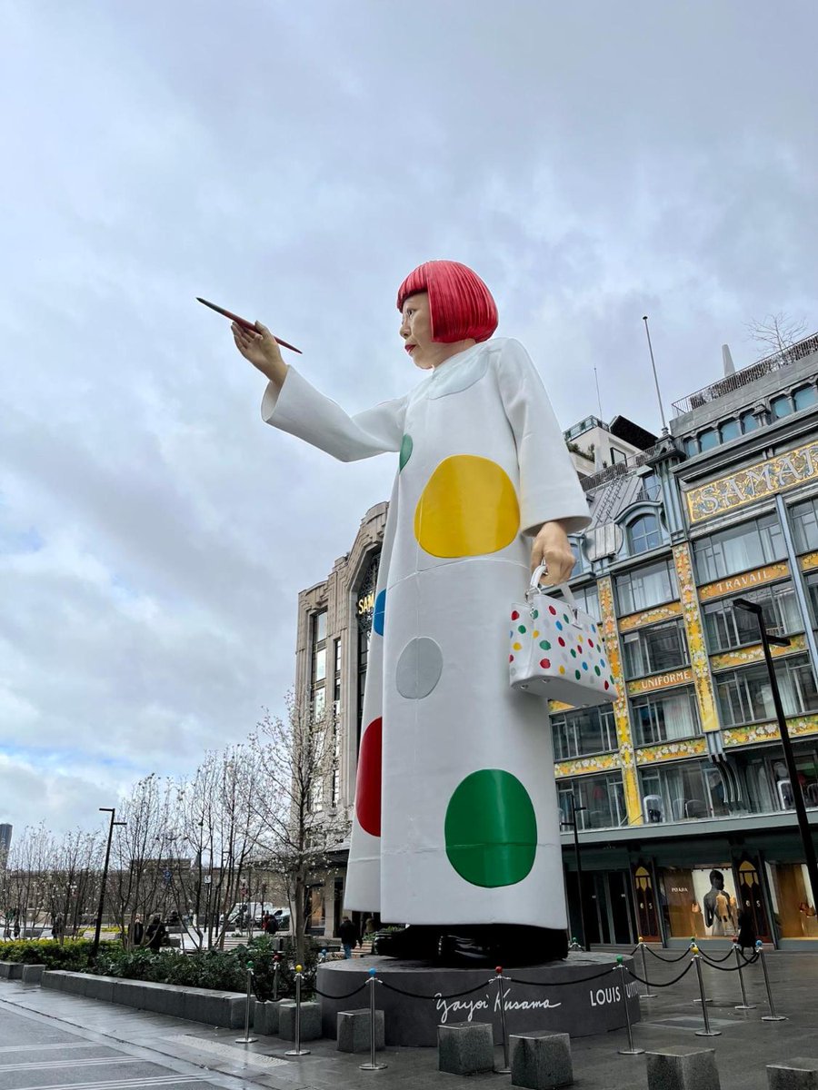 【パリコレ】草間彌生の巨大像がパリ1区サマリテーヌ前に出現。ルイ・ヴィトン本社が入る建物に水玉を描いていています。コラボバッグを手に。