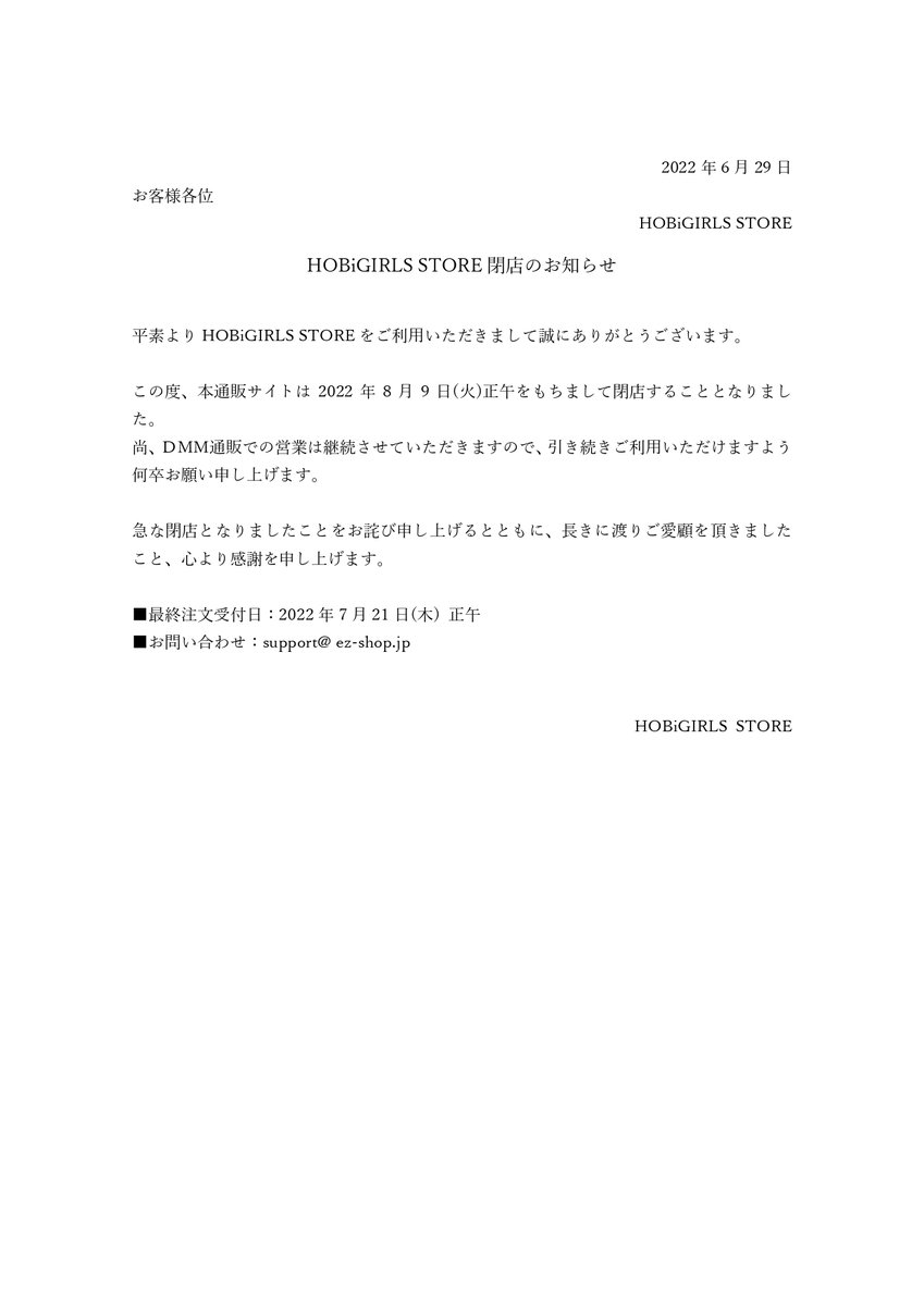 HOBiGIRLS STOREをご利用のお客様に、重要なお知らせとお詫びがございます。
