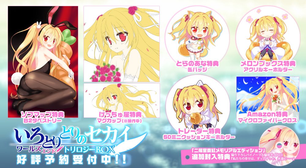 『いろとりどりのセカイ ワールズエンド・トリロジーBOX』全ショップ特典、完成イラスト出揃いました!3月30日(金)発売、現在予約受付中です!!