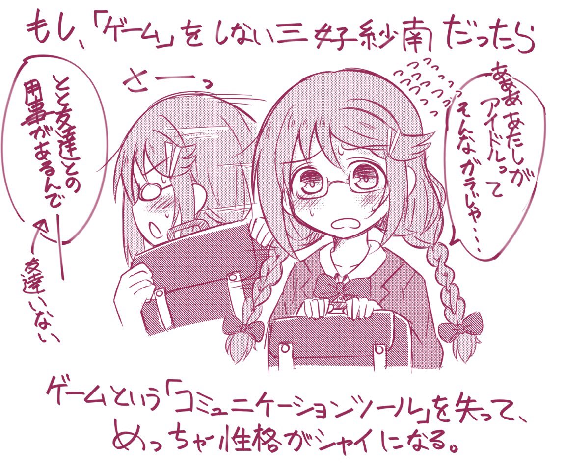 昔描いてたモノですがゲーム規制の条例案が推進されてたらゲームしない三好紗南時空も存在していたのかもしれない (しかしこの紗南ちゃんは好みが別れそうな…)