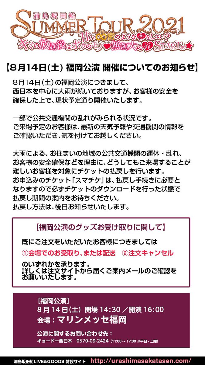 【8/14マリンメッセ福岡公演 払戻し対応についてのご案内】