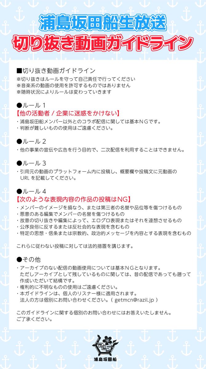 浦島坂田船の生放送の切り抜き動画を作成したいというご要望が多数寄せられております。下記フォームから申請頂ければ黙認したいと思います。
