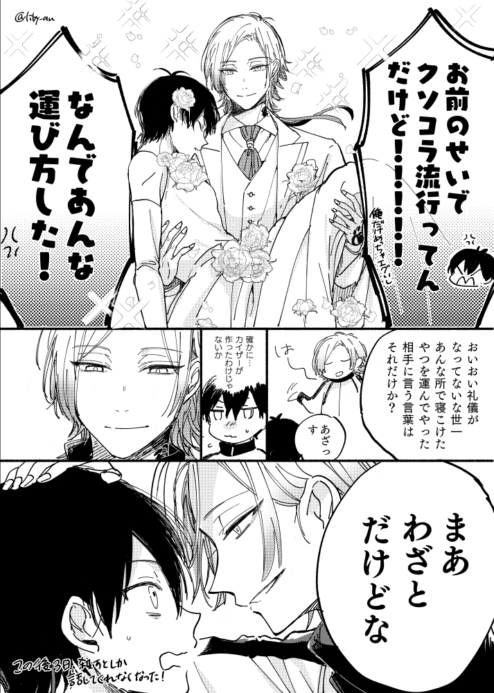 あらすじ:勝負の結果結婚した二人。kisがすごく優しかったりで41大混乱。 でもその生活は実は現実ではなくて…といったお話です。後半はファンタジー要素があります。 子どもの頃会ったことがある設定などなど、好きに描いているので解釈違いにご注意ください。