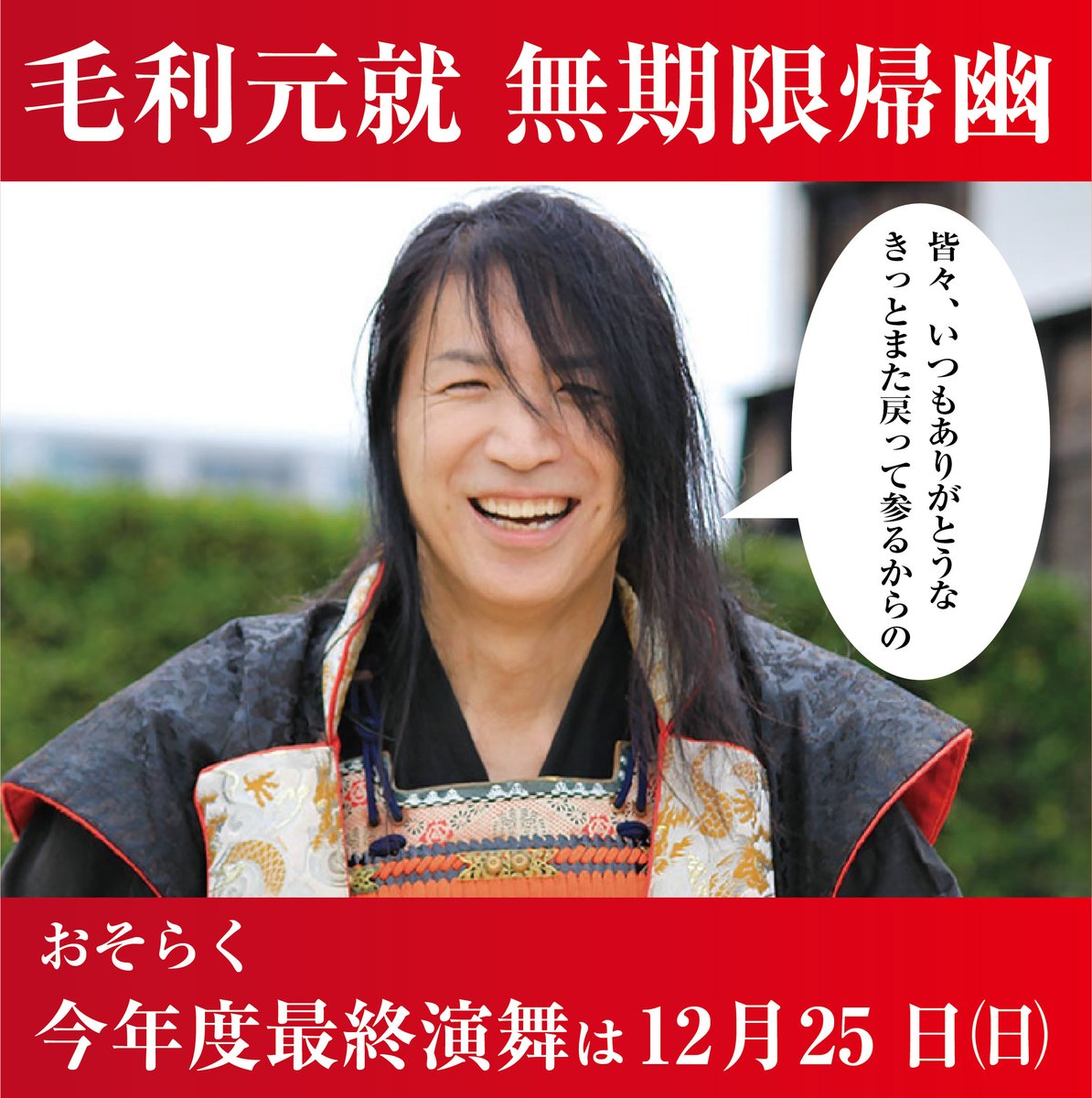 なお、毛利輝元につきましては、現在、活動休止中のため、コメント発表という形での卒業となります。 #安芸ひろしま武将隊