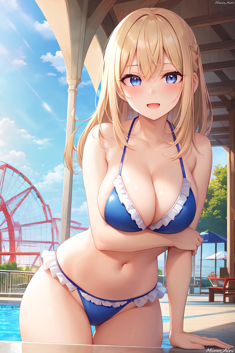 プールで楽しく遊ぶ金髪のお姉さん(水着)