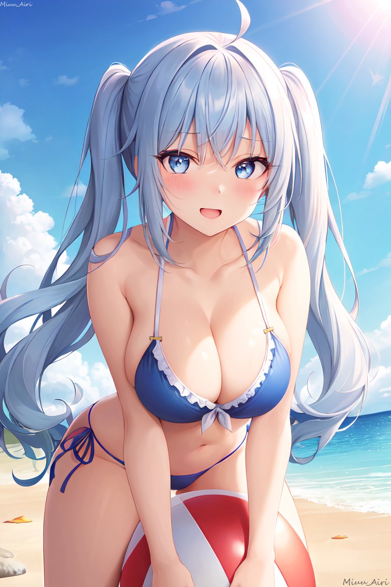ビーチボールで遊ぶ青髪のお姉さん(水着)