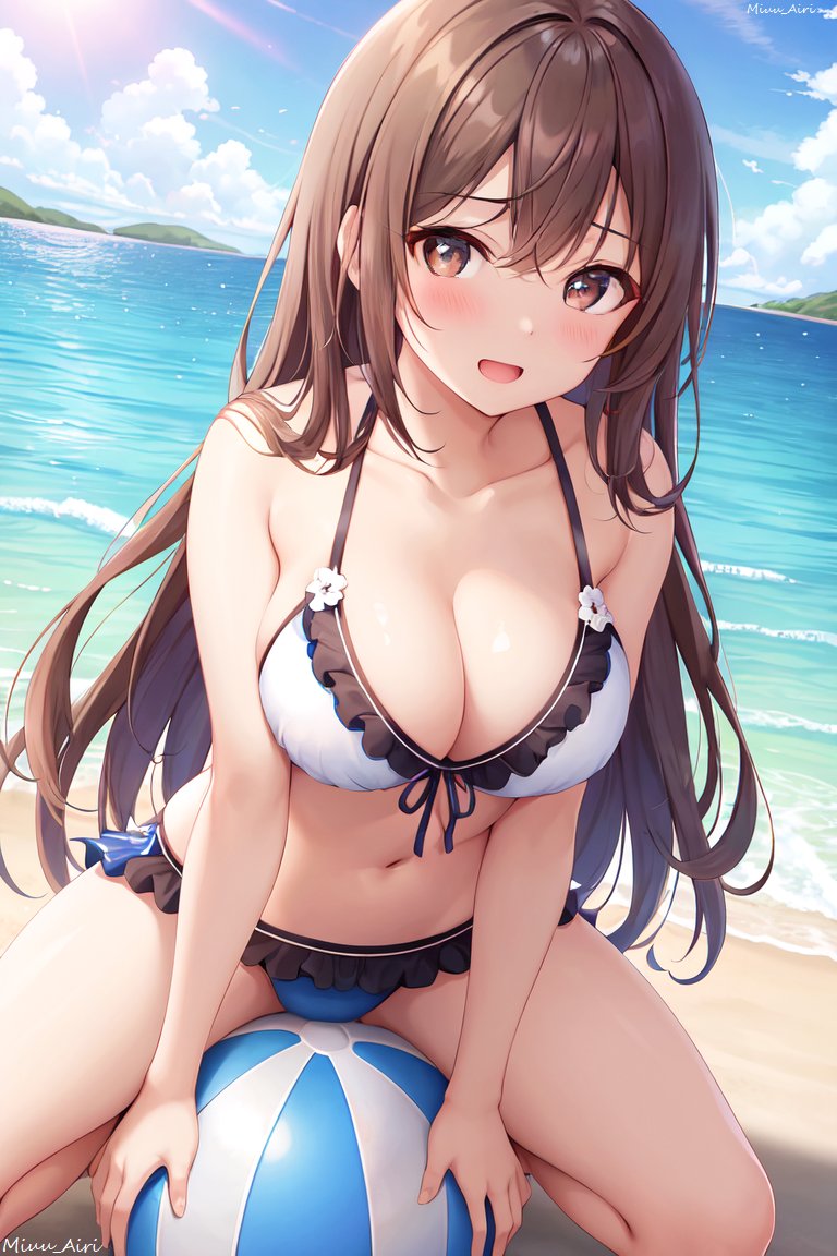 ビーチボールで遊ぶ茶髪のお姉さん(水着)