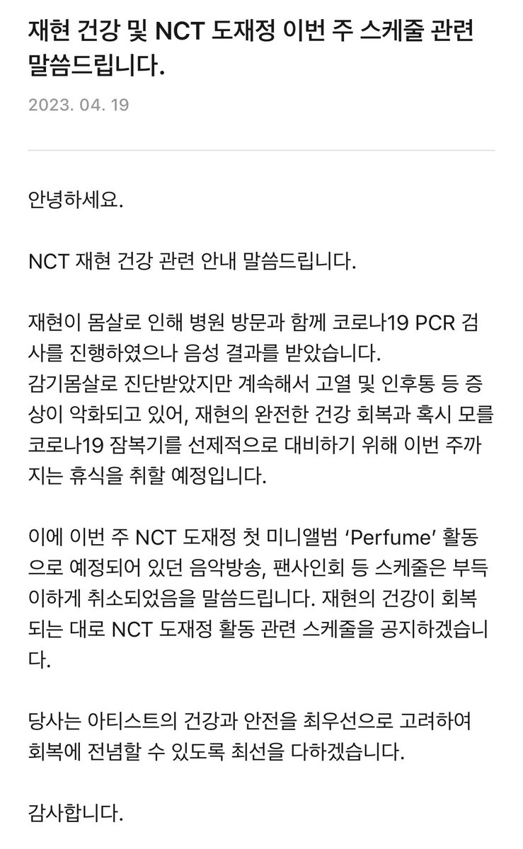 [230419] Information about NCT #JAEHYUN's health. He visited the hospital and conducted a COVID-19 but received a negative result. Although he was diagnosed with a cold, symptoms such as high fever and sore throat, his condition continues to deteriorate +