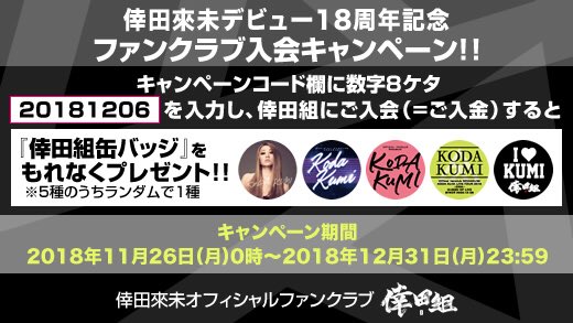 ご入会の際、キャンペーンコード欄に【20181206】を記入していただくと、『倖田組缶バッジ(5種のうちランダムで1種)』をもれなくプレゼント♪