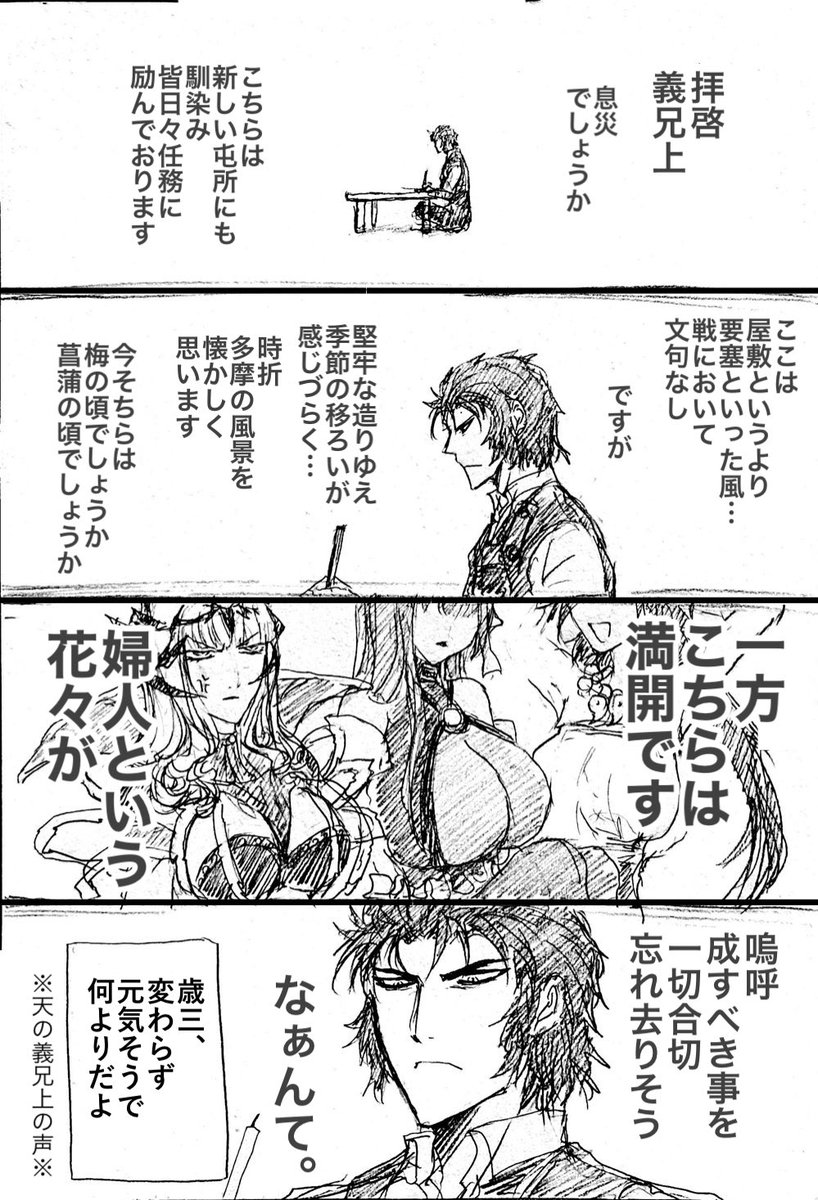 土日に間に合ってない一ぐだ♀ ~ふくちょうのてがみ~ 今でも書いてるかもしれないという妄想。 思えばモテ手紙なり、後の戦いの間は冗談言って周りを和ませてたなり、少なくとも史実では…本来気さくで明るい人だったのかな。 (1/3)