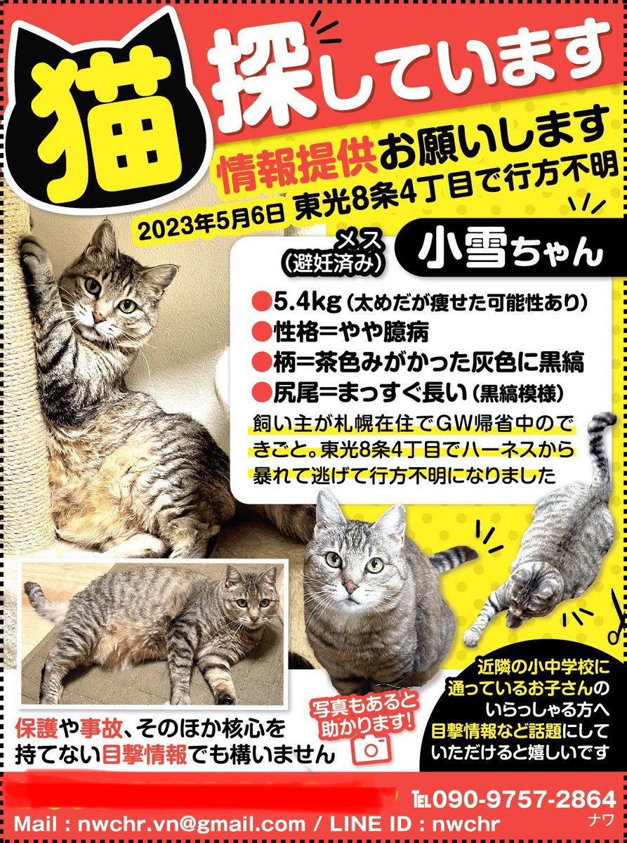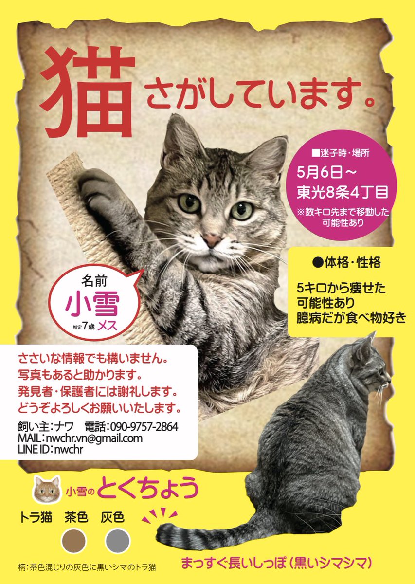 小雪が居なくなって28日。姿も見えず辛い毎日です🥲 旭川の方で職場にチラシ貼れるよ、従業員スペースに貼れるよというお方がいましたら、このアカウントフォローの上(見つかったらお知らせするので)印刷して協力お願いできないでしょうか…!遠くに行っている可能性も十分あります🥲 #旭川 #迷子猫