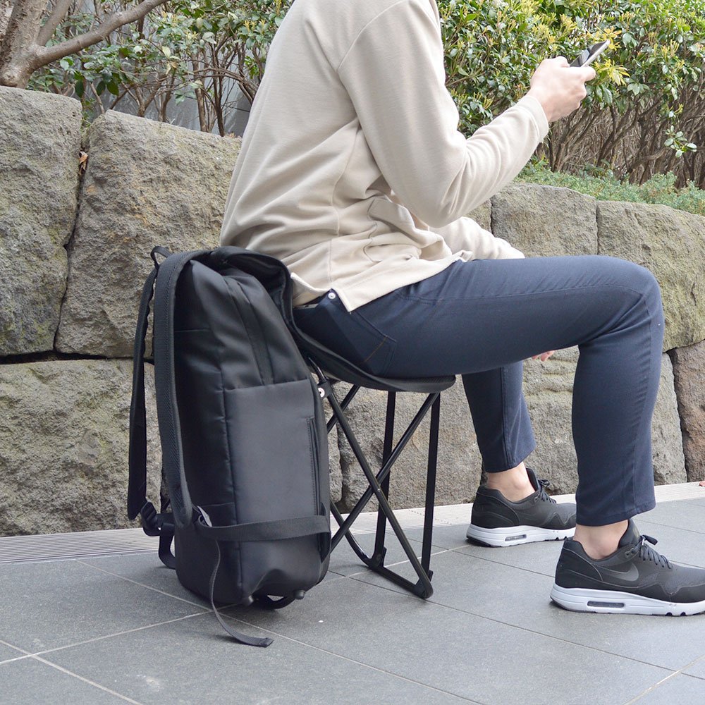 座りたいときに座れて、すぐに片付けられる折りたたみイスが内蔵されたリュックです。