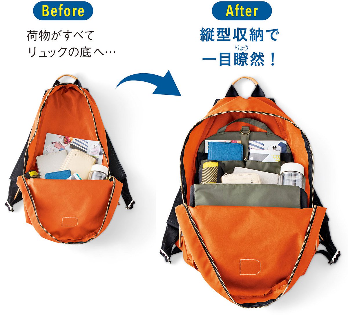 縦収納でリュックの上部までムダなく荷物を収納できて、荷物の出し入れもぐっとスマートに!