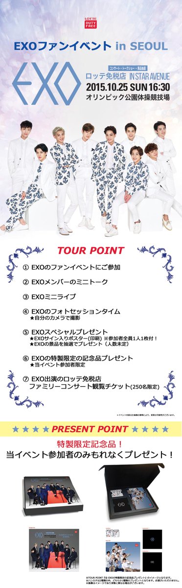 【拡散希望】「ロッテ免税店EXOファンイベント&EXO出演のロッテファミリーコンサート観覧」本日販売開始!フォロー&このツイートをRTで3名様にEXO特製限定記念品プレゼント!ツアー詳細⇒suntravelweb.com/products/detai…
