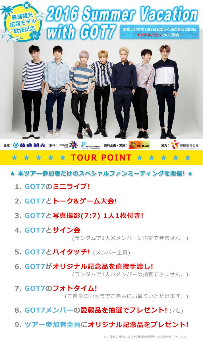 『【日本公式】2016 Summer Vacation with GOT7』2016年6月7日(火)19時から受付開始!写真撮影、サイン会、ハイタッチなど盛り沢山の内容!詳細はこちら⇒suntravelweb.com/products/detai…