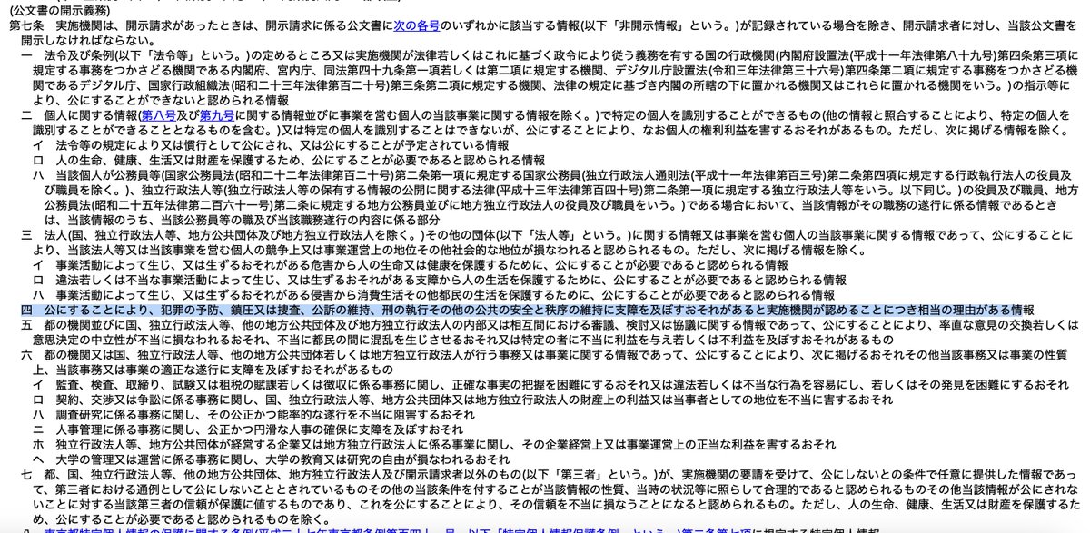 7条4号って「公にすることにより、犯罪の予防、鎮圧又は捜査、公訴の維持、刑の執行その他の公共の安全と秩序の維持に支障を及ぼすおそれがあると実施機関が認めることにつき相当の理由がある情報」じゃない?