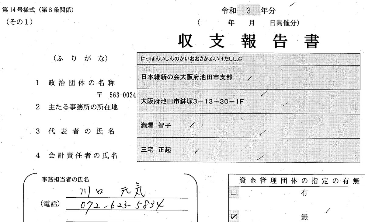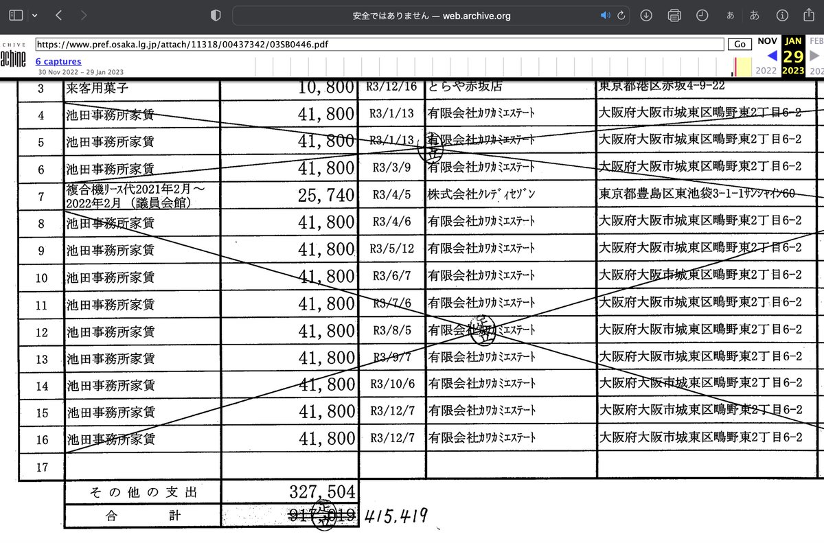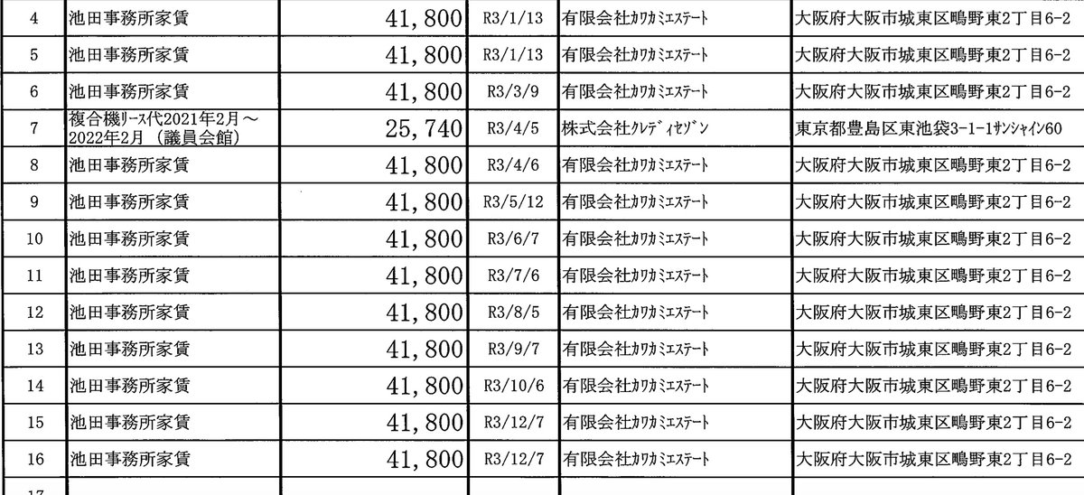 足立康史議員の政治資金から池田の家賃で41800円が毎月計上されてます