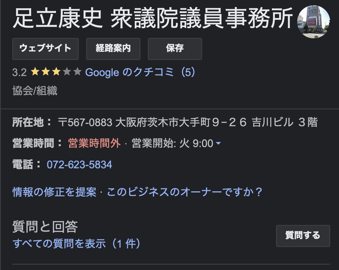 維新の会池田支部に電話したら、足立康史事務所だったぞw