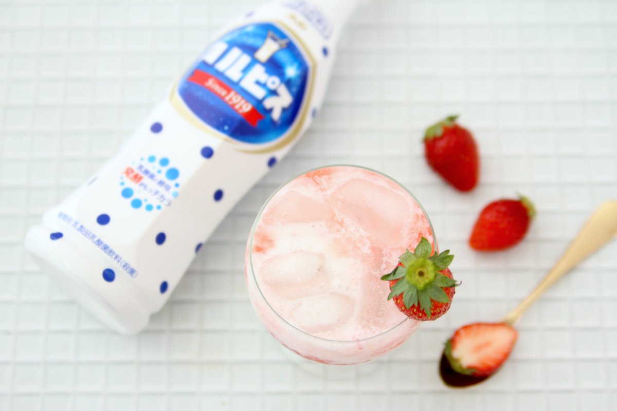 苺5粒を潰し、氷を入れて牛乳100ml、カルピス原液大さじ2混ぜて注ぐ。