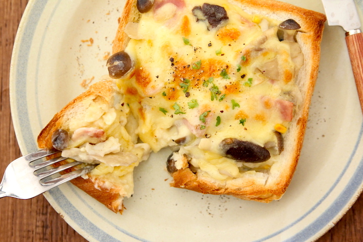 パンの底残しくり抜く。牛乳、おろしにんにく、ベーコン、冷凍茸を4分チンしコンポタの素、くり抜いたパン混ぜパンに入れチーズのせトースト