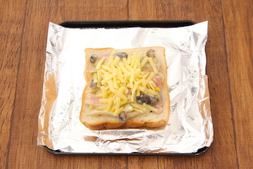 プライドポテトにピザ用チーズかけアルミホイルのせ7分トーストしオリーブ油、黒胡椒