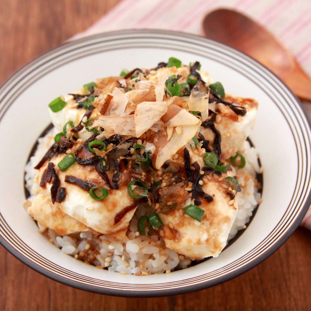 器にご飯を盛り、ずっとおいしい豆腐200g、塩昆布6g、鰹節大2をのせ青葱、白ごま小1散らしポン酢小4、ごま油大1/2、みそ・おろしにんにく各小1/2混ぜてかける。