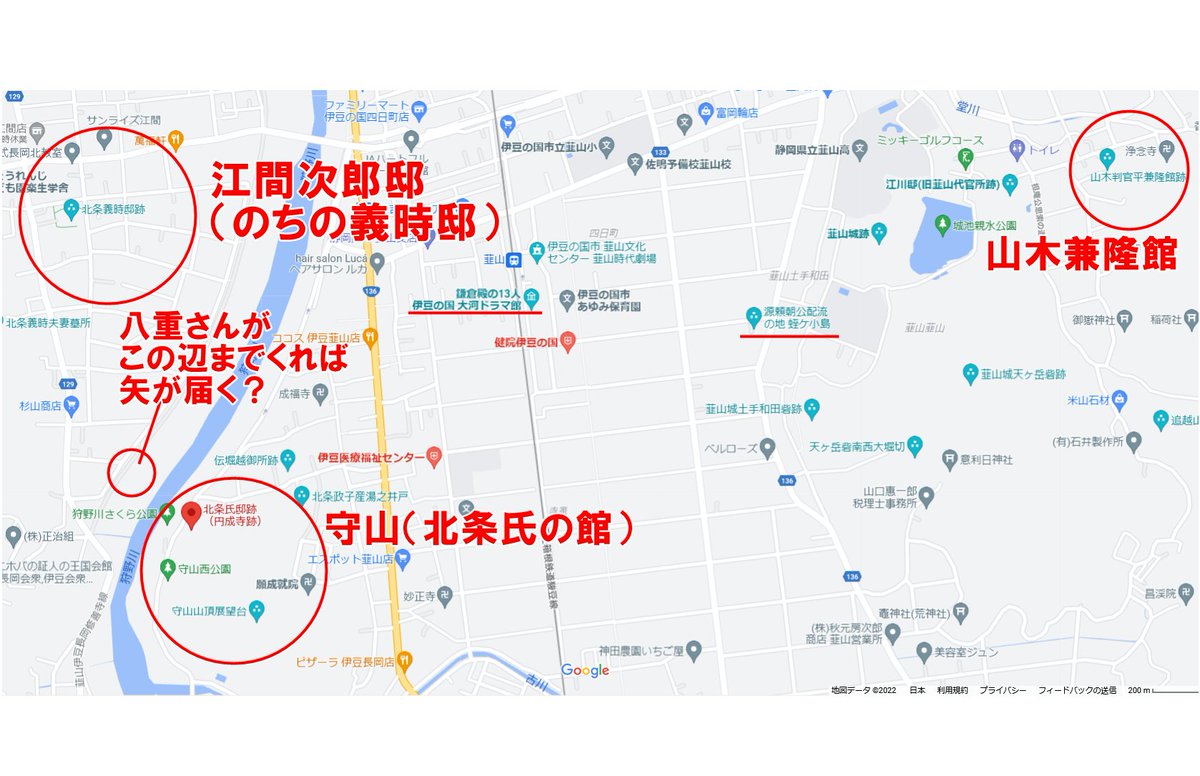 北条義時が住む北条館と、八重が住む江間次郎の屋敷の距離は、狩野川を挟んで直線で700mぐらい。八重さんが川辺まで行けば、どうにか矢が届く、かも?