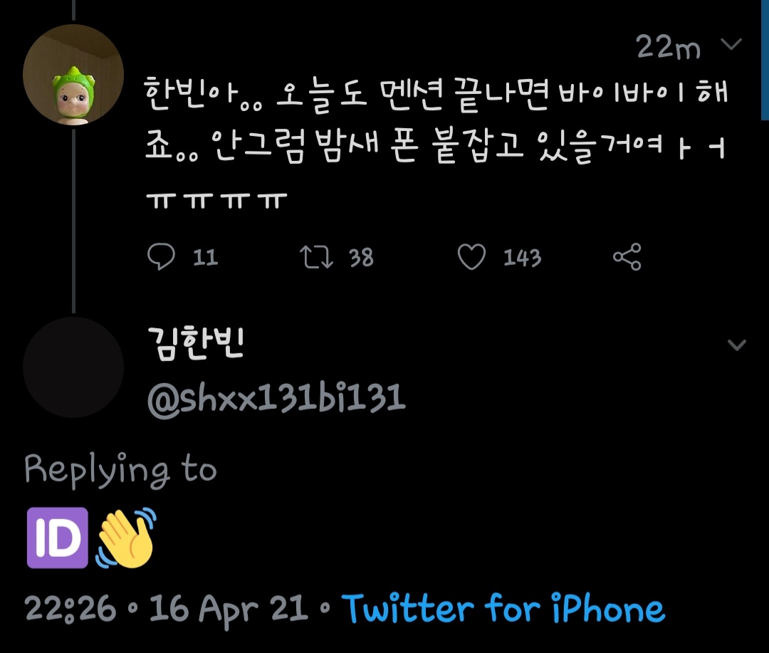 🆔️ : ฮันบินอ่า.. ถ้าวันนี้เมนชั่นแฟนเสร็จแล้วมาบ๊ายบายด้วยนะ.. ถ้าไม่อย่างนั้นฉันจับโทรศัพท์ทั้งคืนแน่ㅏㅓㅠㅠㅠㅠ