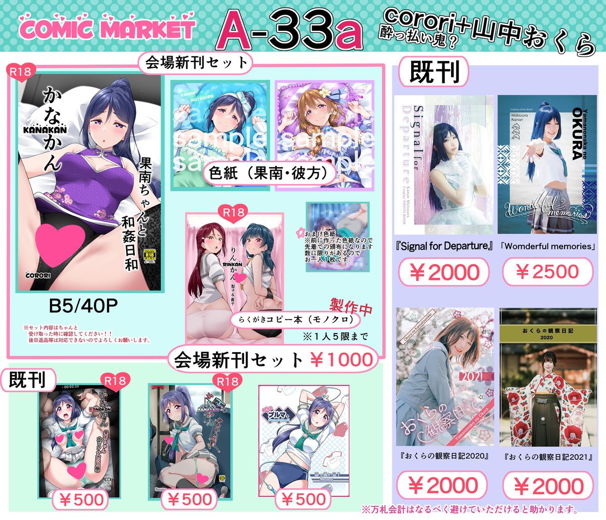 【C99冬コミのお品書き】 2日目(31日)スペース・A-33a サークル.corori 今回は果南ちゃんの新刊セットになります、果南ちゃんと彼方ちゃんの色紙とらくがきコピー本(作れる範囲で作っていきます)セットです。 おくらさんの写真集と私の既刊を持っていきます~🙏🙏🙏 当日はよろしくお願いします🙏🙏