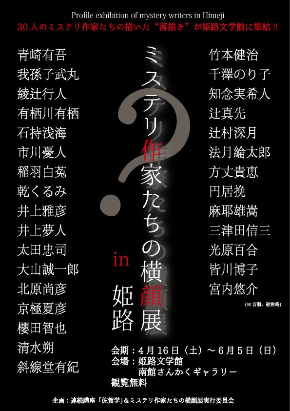 コロナの状況にもよりますが、4月23日(土)には綾辻行人・有栖川有栖・竹本健治・方丈貴恵によるトークショーも開催予定。定員百名で抽選制。こちらの要項に従ってご応募ください。himejibungakukan.jp/events/event/m…
