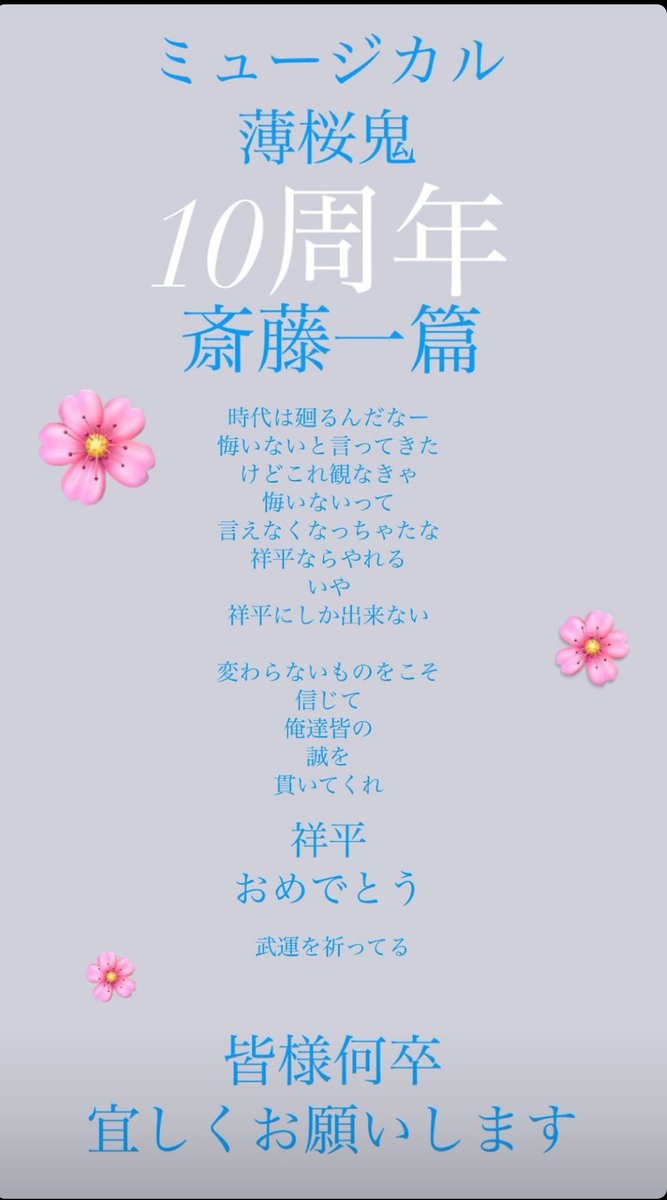 松田凌のブログってミュージカル『薄桜鬼』斎藤一篇の記者発表の日からだから9年じゃ無くて10年ですね…。もう声を大にしては言えないですね…。松田凌っぽい出来事ですが、マネージャーが感極まるのが先行してチェックポンコツですみません…🥲