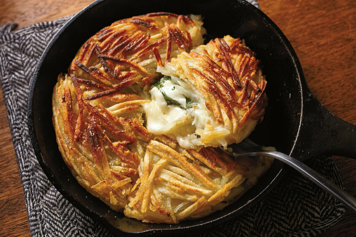 ①スキレットorフライパン(小)にオリーブ油を熱し、細切りじゃがいもを入れる
