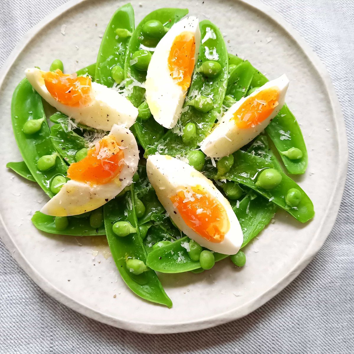 ゆで卵と盛りつけて、オリーブ油と塩、こしょう、チーズだけで華やかです👌