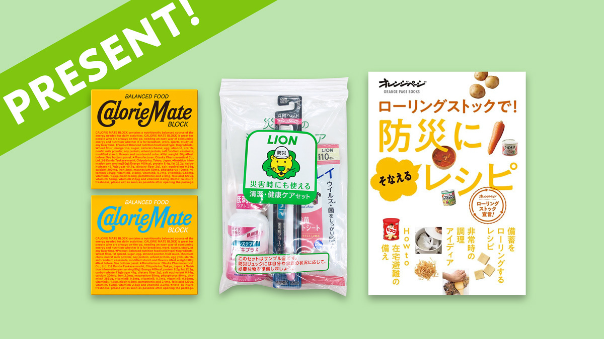 衛生ケア製品のセットやバランス栄養食セット、さらにはローリングストックのノウハウが詰まった本を、合計15名様にプレゼント🎁