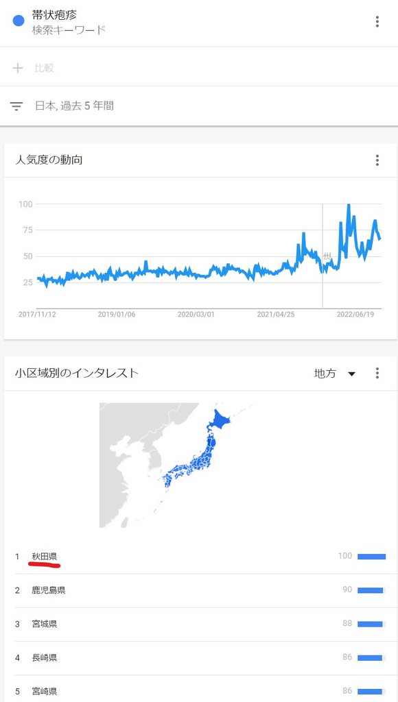 Googleトレンドで「帯状疱疹」を調べるとですね... グラフの形がどこかで見た形であり、そしてトップがあの秋田県 データは正直だw