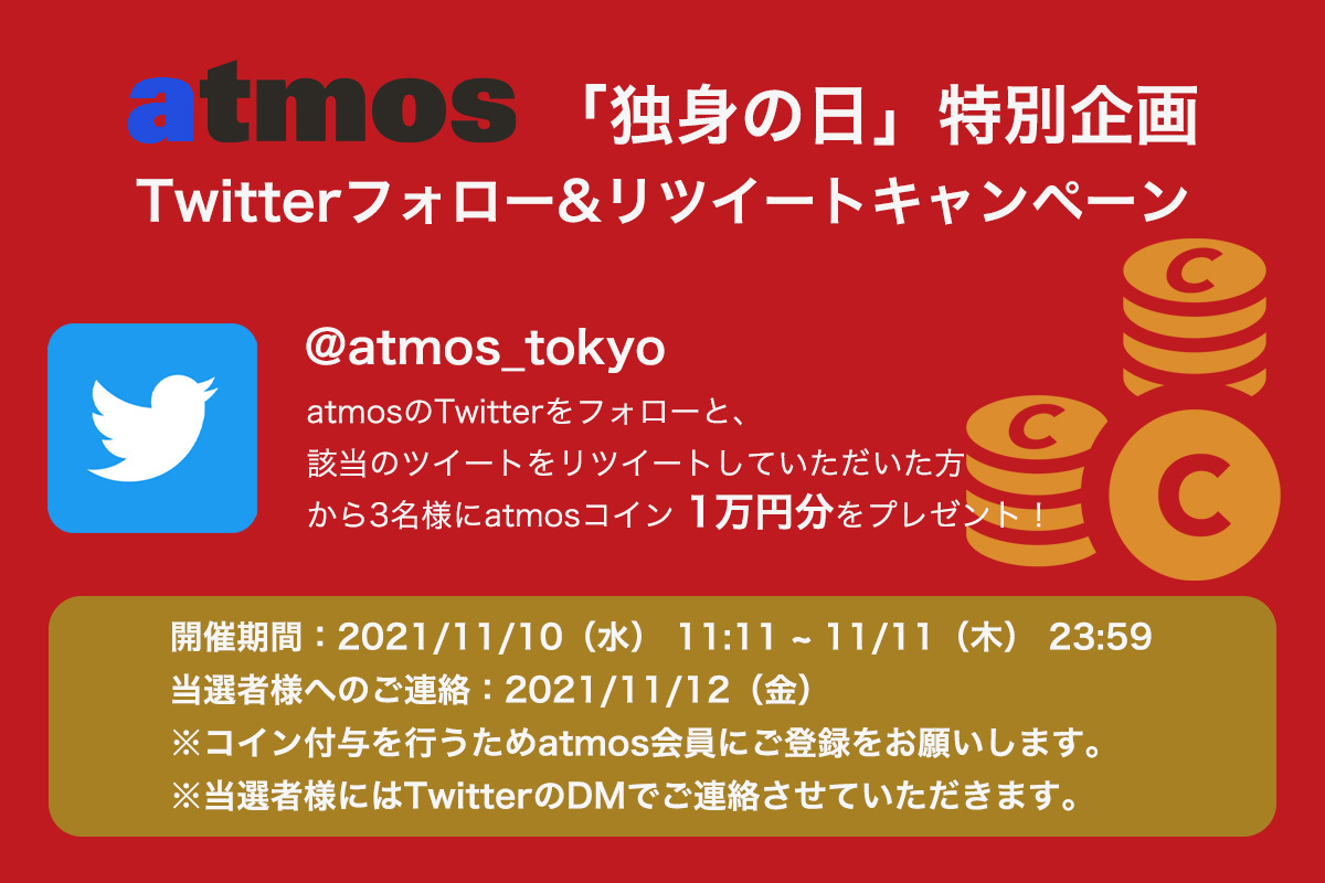 対象期間中にatmosのTwitter(@atmos_tokyo)をフォローと、こちらのツイートをリツイートしていただいた方の中から抽選で3名様にatmosコイン 1万円分(1万コイン) をプレゼント!