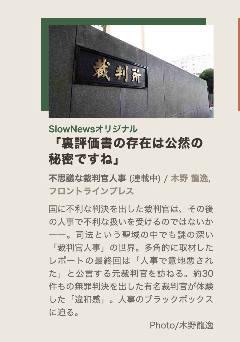 国に不利な判決を出した裁判官は左遷される……それは本当かに迫った「不思議な裁判官人事」。読み応えたっぷりの連載は5回目=最終回です。取材者は木野龍逸さんら。フロントラインプレス @FRONTLINEPRESS1 の仕事です。サブスクの「スローニュース」に掲載されています!