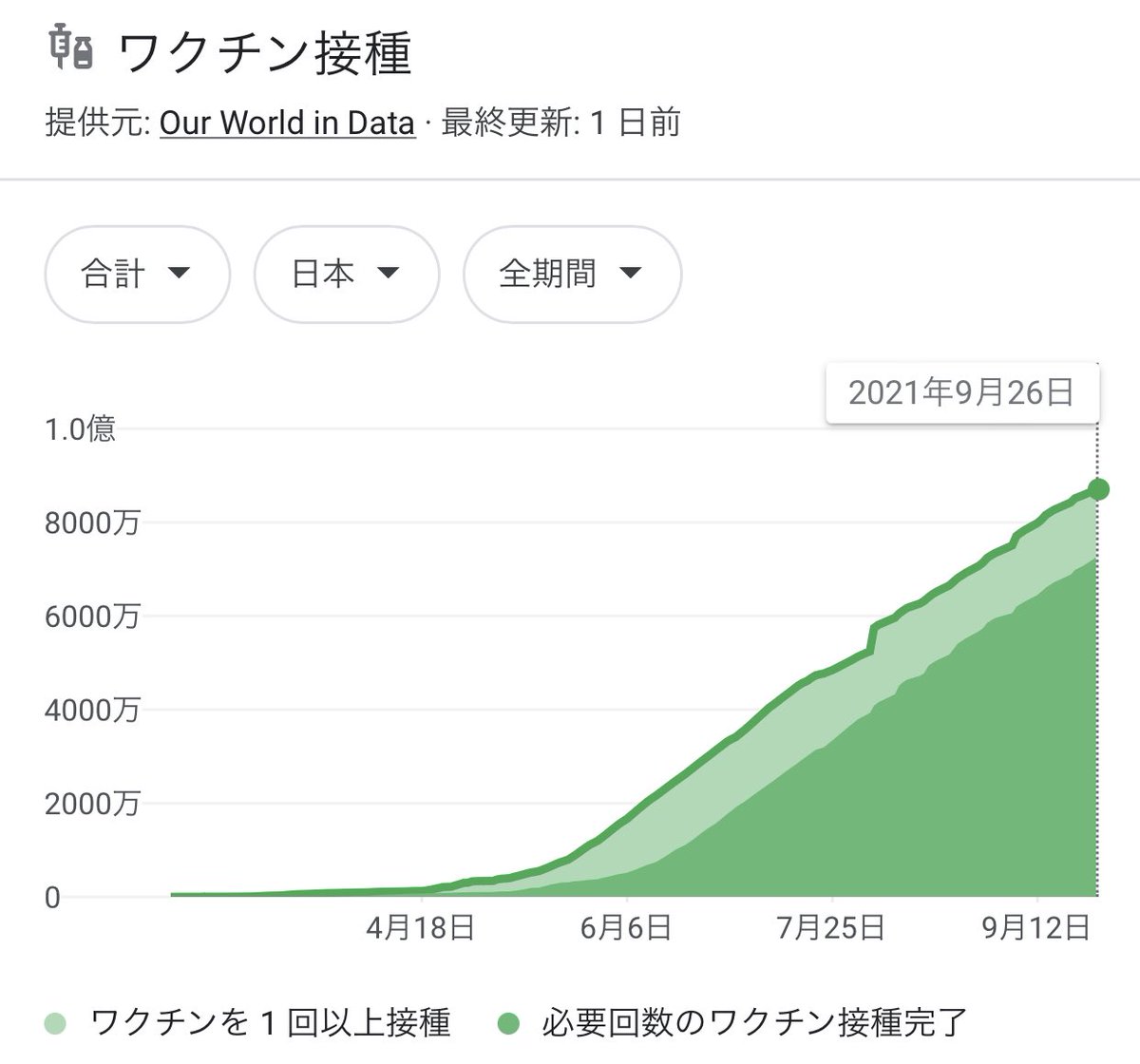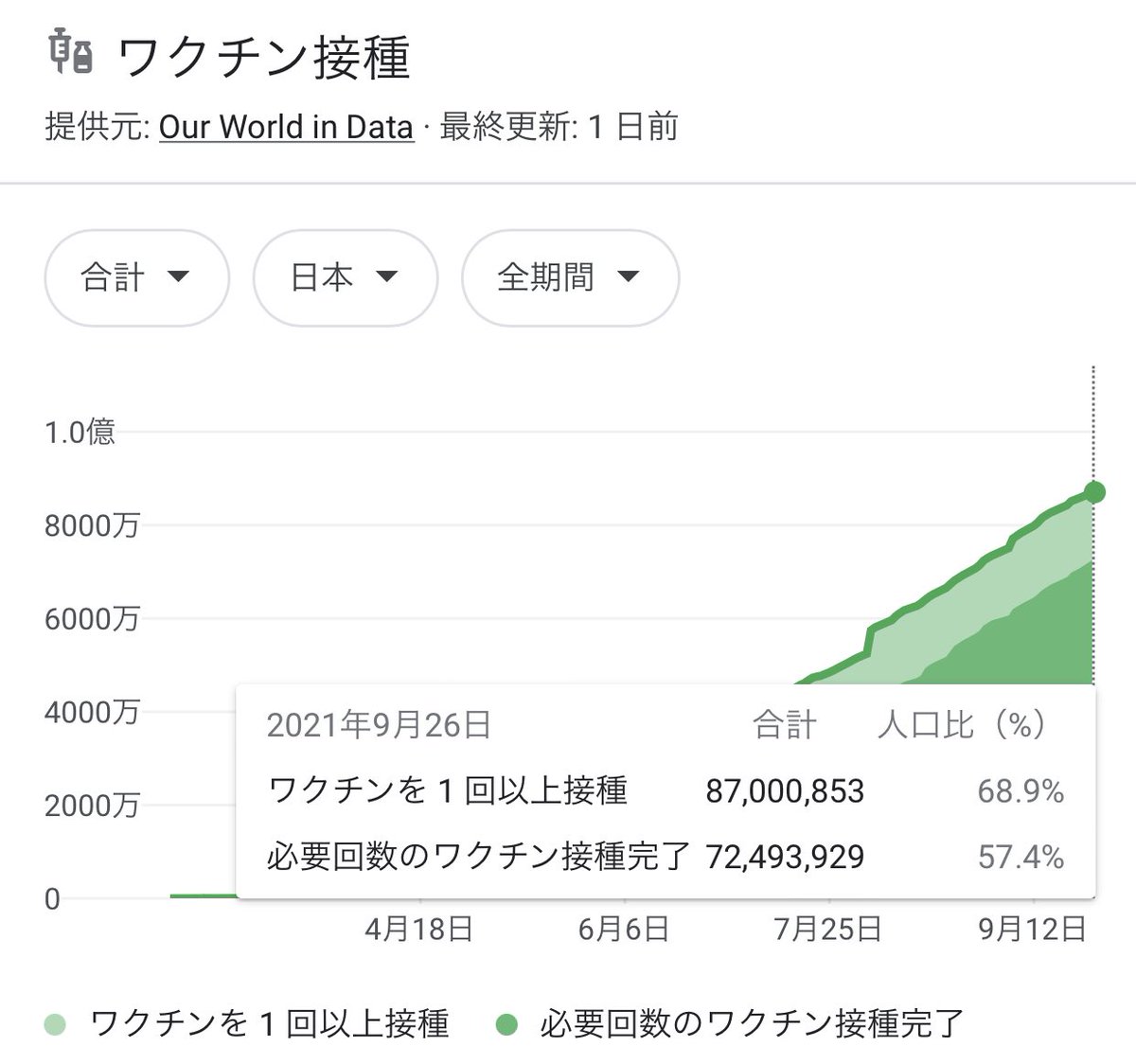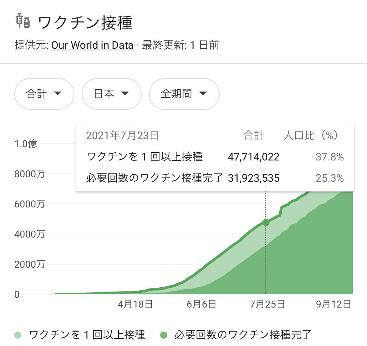 これ、「何かがあったに違いない…」ってなるんですけど7月下旬のオリンピック開会式の日と比べてもワクチン2回接種者が2倍超の7000万人超えになって人口の過半数がフルワクチンなんですよね。