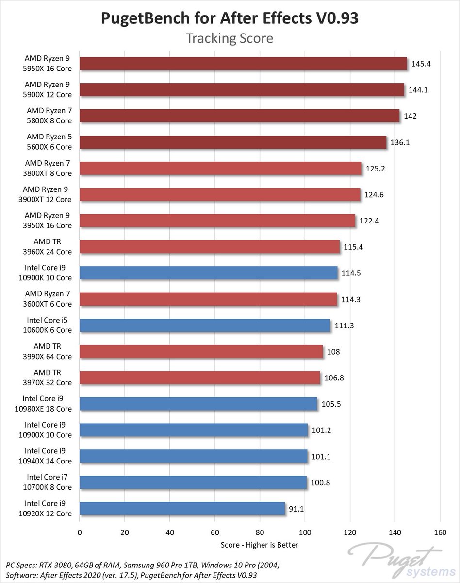 Zen3 Ryzen 5000シリーズでAdobe製品も完全にAMDの時代に。マルチコア最適化されておらずIntel最後の牙城だったAfter EffectsもAMD圧勝となり何と総合スコアで6コア5600Xが10コア10900Kを抜く結果に twitter.com/pugetsystems/s…