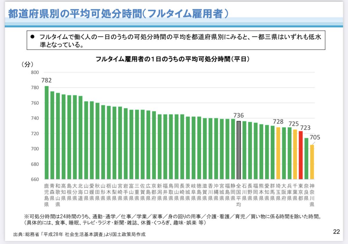 東京は中間層(手取り収入が中央値付近)の可処分所得-基礎支出がワースト6位なのと平均可処分時間と通勤時間も悪いというデータ