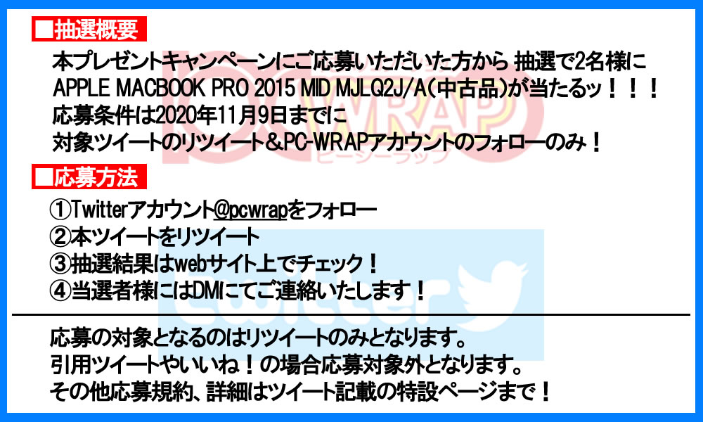 このツイートをRT&@PCWRAPをフォローでMACBOOK PROを抽選で2名様にプレゼント!
