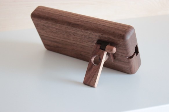 充電しながら使用できて、裏側にスタンドが付いており角度が調整できます。素材はウォールナット、サイズはW98㎜×D33㎜×H220㎜📱 is.gd/w7oDLG