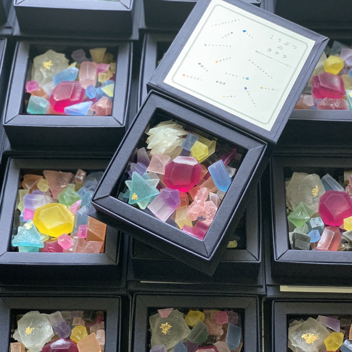 和菓子の琥珀糖から作られた、鉱物をデザインしたお菓子💎 標本箱、採取箱のようなパッケージも素敵。食べるのがもったいない… harapecolab.base.shop